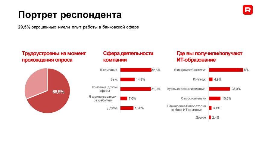 На момент опроса более 68% опрошенных были трудоустроены и 14,8% работают/работали в банковской сфере. В прошлом году таких респондентов было только 6,7%, что говорит о повышении интереса – люди действительно приходят работать в банки.