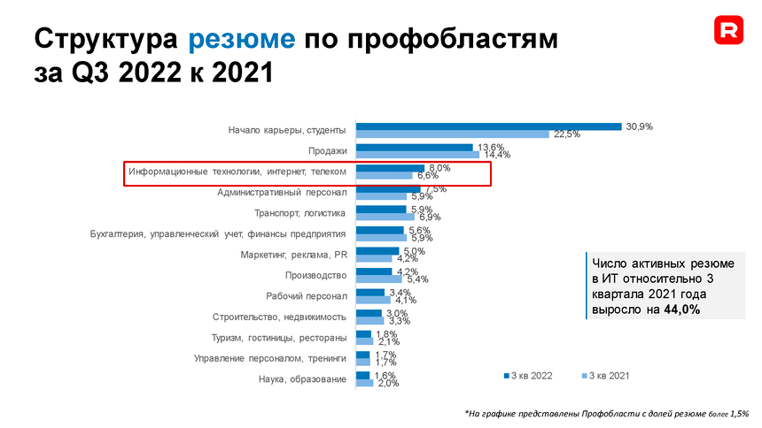 Также стоит отметить, что число активных резюме в ИТ относительно 3-го квартала 2021 года выросло на 44,0%.