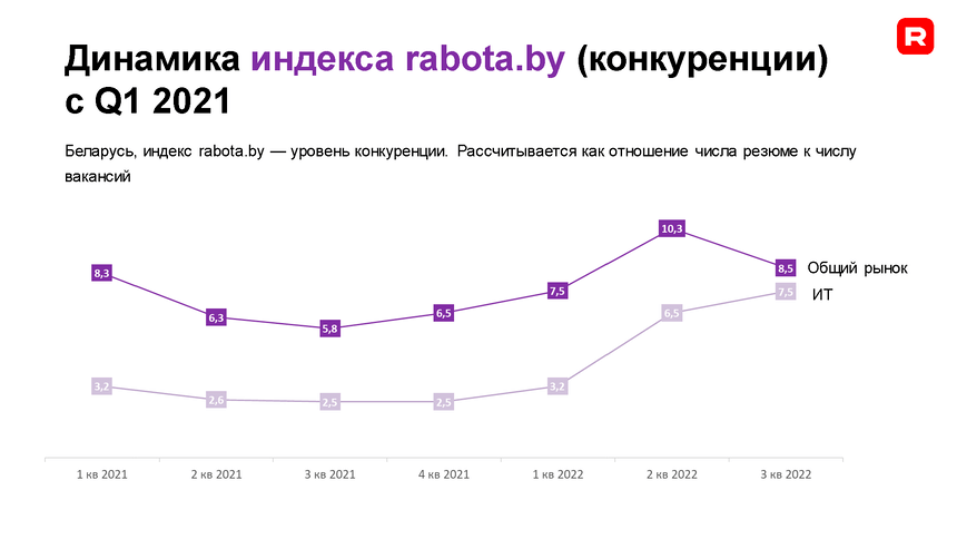 Снижение числа вакансий и увеличение количества резюме неизбежно приводят к росту конкуренции (она показывает, какое количество резюме приходится на одну вакансию).