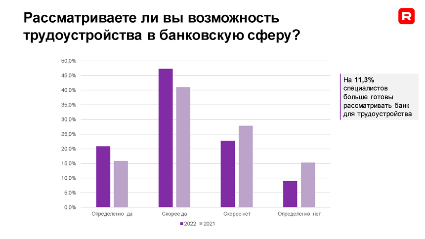 Интерес к работе в банке подтверждает и следующий график. На 11,3% в сравнении с предыдущим годом увеличилось количество ИТ-специалистов, готовых рассматривать банк для трудоустройства.