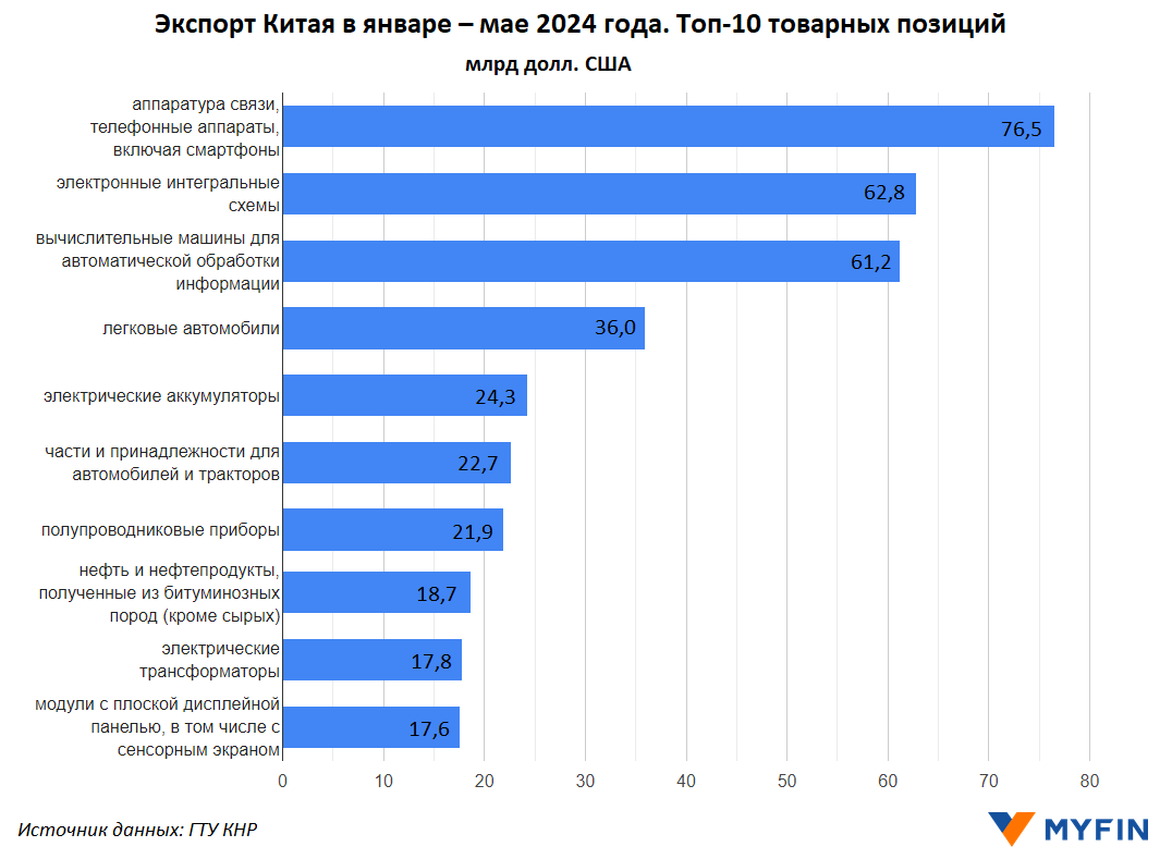 В январе – мае 2024 года основными товарными позициями китайского экспорта были: