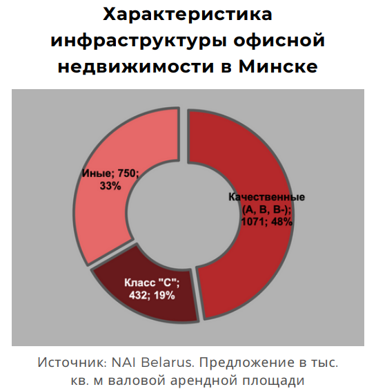 Более 430 тыс. кв. м офисов в зданиях «класса С» или офисов более высокого качества, но не попадающих в сток современных из-за малой арендной площади. Порядка 750 тыс. кв. м предлагали арендаторам иные административно-офисные объекты, в том числе коммунальные или ведомственные.