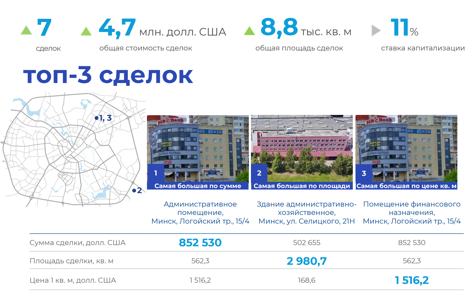 Во II квартале число сделок заметно растет: площадь в сделках больше в 10 раз, стоимость – в 20 раз. Самая крупная сделка на сумму $1,6 млн. заключена по трем помещениям общей площадью 1,1 тыс. кв. м, расположенным на Логойском тракте, 15/4 (два помещения) и ул. М. Богдановича, 122, которые приобретены «Банком РРБ» у застройщика «Арэса-сервис».