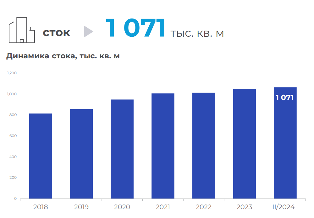 Новое предложение офисных площадей в объектах коммерческой недвижимости Минска во II квартале 2024 года отсутствует. На конец периода сток офисных помещений составляет 1 071 тыс. кв. м. Ввод новых офисных площадей во второй половине 2024 года может составить более 60 тыс. кв. м в МФК Prizma, МФК на пр. Победителей, 63Б, МФК Golden Pearl и БЦ «Левада». Prizma может стать первым бизнес-центром в стране, возведенным по международным экологическим стандартам LEED.