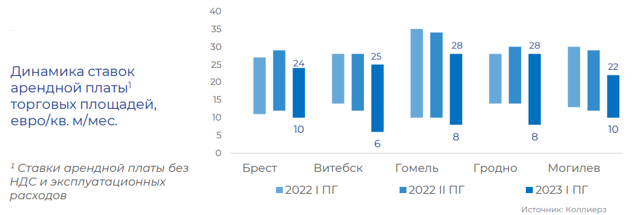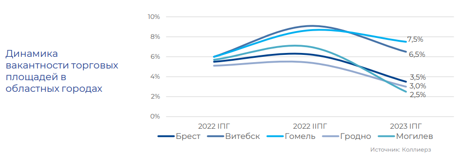 Вакантность торговых центров в областных городах в 2-4 раза ниже среднего значения в Минске, а уровень ставок аренды по нижнему порогу почти сопоставим. Кроме экономических факторов, даже с учетом более низкого уровня заработной платы в регионах, на этом может также сказываться не такое высокое, как в Минске, наличие современных торгово-развлекательных объектов и недостаточность качественного предложения.