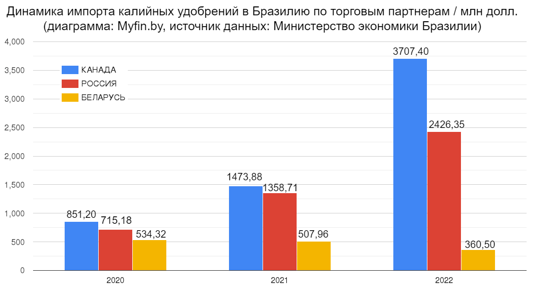 Таким образом, в 2022 году по сравнению с предыдущим годом южноамериканское государство сократило импорт калийных удобрений из Беларуси почти на 30% (-$147,46 млн). В то же время закупки из Канады в стоимостном выражении выросли в 2,5 раза, а из России – практически в 2 раза.