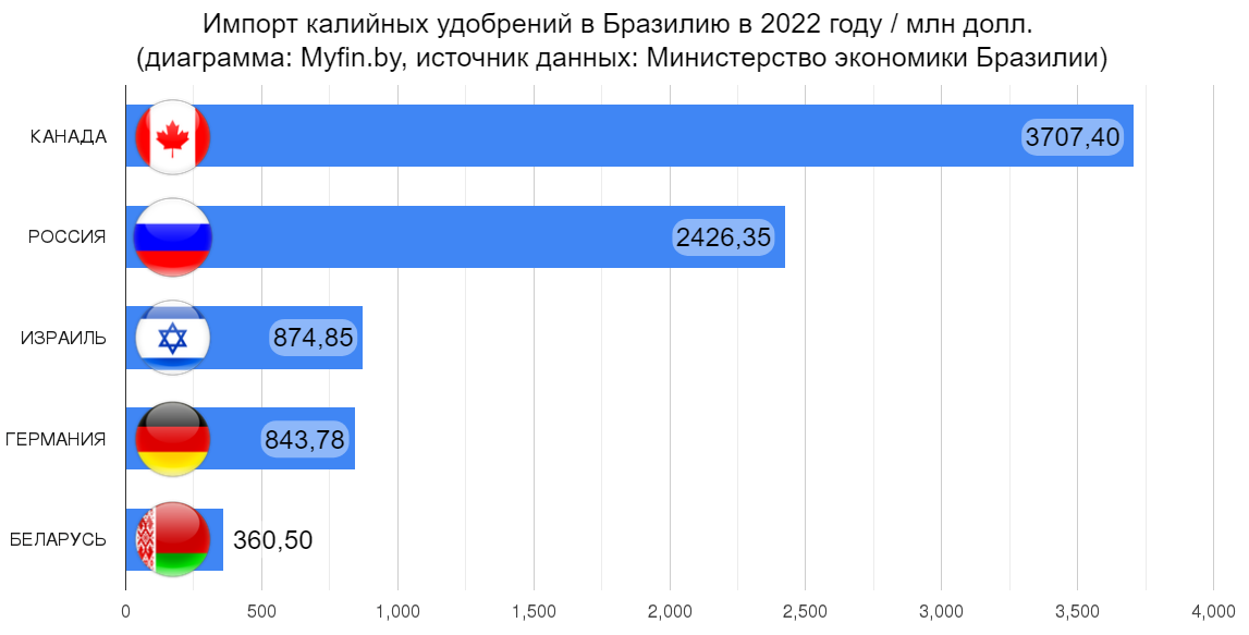 По итогам января – декабря 2022 года в рейтинге поставщиков калия в Бразилию наша страна оказалась на пятой позиции по объему выручки, уступив всем основным конкурентам: Канаде, России, Германии и Израилю.