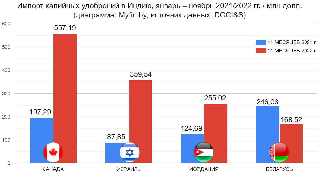 За 11 месяцев 2022 года Индия импортировала калийных удобрений на сумму $1,5 млрд. Для сравнения: за январь – ноябрь 2021 года импорт составил $839,04 млн.