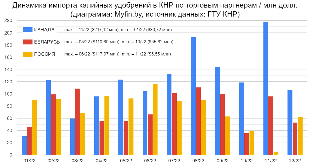 В разрезе 2022 года китайский импорт калия из Республики Беларусь был на максимуме в марте ($108,80 млн) и августе ($110,60 млн), минимальные значения зафиксированы в январе ($45,89 млн) и октябре ($35,62 млн). Максимальный объем ввоза (в стоимостном выражении) из Канады отмечен в ноябре ($217,12 млн), а из Российской Федерации – в июне ($117,07 млн).