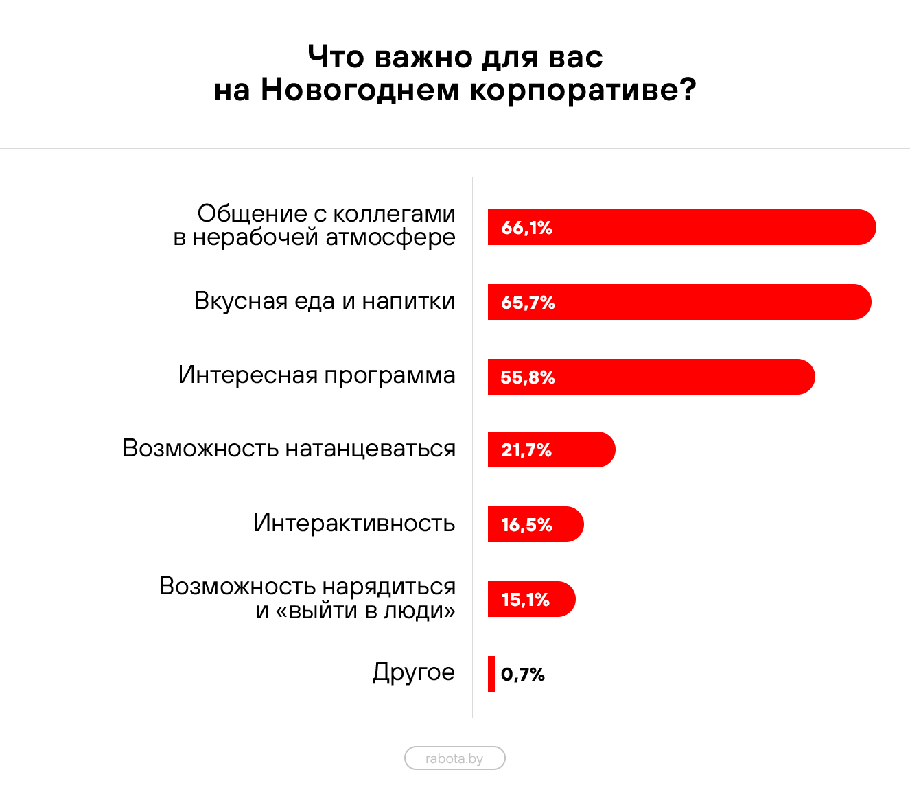 По мнению участников опроса, самое важное на корпоративе – это возможность пообщаться с коллегами в нерабочей атмосфере, вкусная еда и напитки, а также интересная программа.