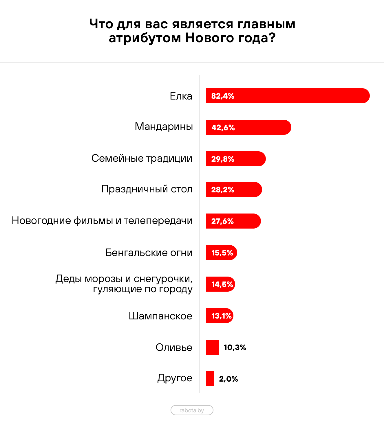 В преддверии праздника исследовательский центр rabota.by провел опрос среди 1692 сотрудников белорусских компаний, чтобы выяснить: чего они ждут в Новый год от работодателя, хотят ли отметить праздник с коллегами и что для них является главным атрибутом Нового года.