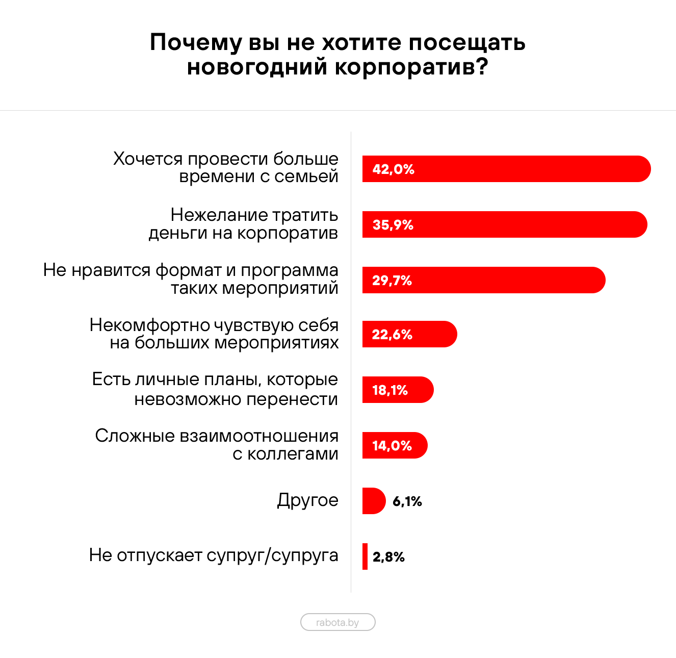 Оказалось, что самая популярная причина – желание провести больше времени с семьей. Также респонденты объясняли свой отказ тем, что не хотят тратить деньги, им не нравится формат и программа вечеринки, они некомфортно чувствуют себя на больших мероприятиях либо у них не сложились отношения с коллегами. Также одна из причин – личные планы, которые невозможно перенести на другое время.
