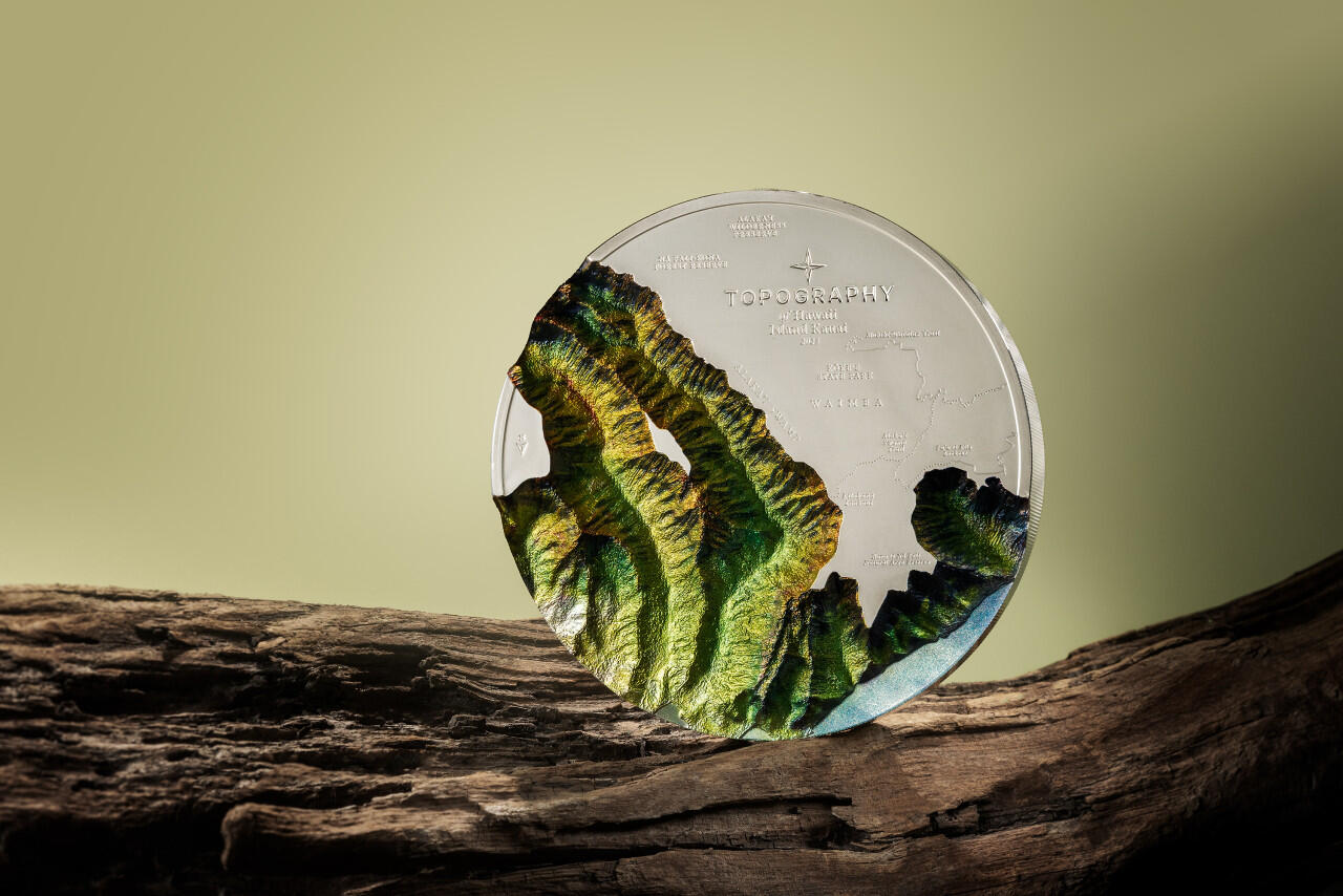 Одна из серебряных коллекционных монет посвящена острову Кауаи (Гавайские острова). На аверсе представлен профиль короля Карла III. Реверс выполнен в виде карты, где искусно изображен рельеф местности.