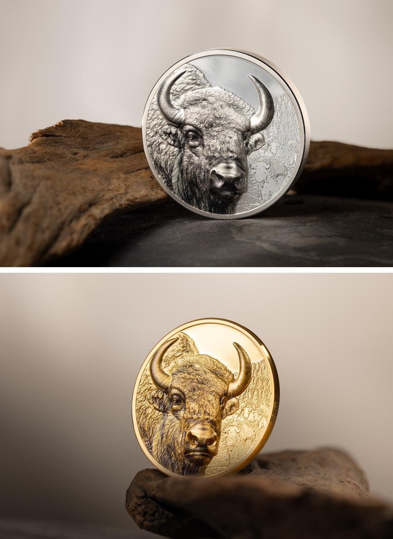 Монголия представлена серебряными и золотыми коллекционными монетами с изображением бизона.