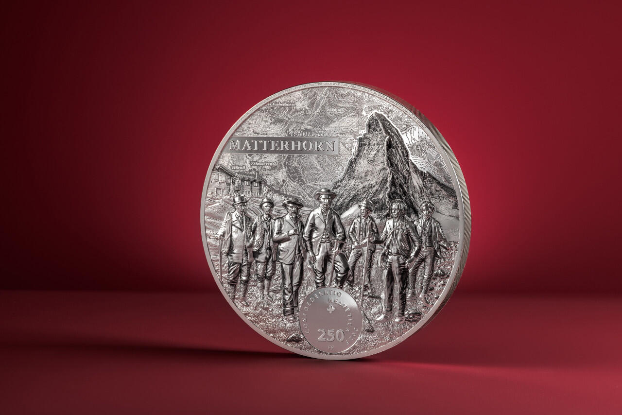 Двухкилограммовую монету представила Швейцария. Памятная серебряная монета номиналом 250 франков выпущена к 160-летию первого восхождения на гору Маттерхорн.