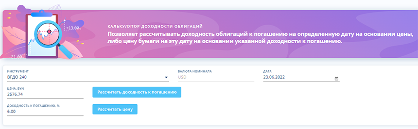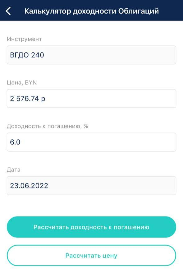 Купить сегодня 23.06.2022 облигации ВГДО 240 можно с доходностью 6%, цена составляет 2576,74 BYN (1 017,31 USD) – это немного дороже текущей стоимости 2568,08 BYN (1 013,89 USD). Для самостоятельного расчета доходности можно воспользоваться информацией из приложения AIGENIS invest: