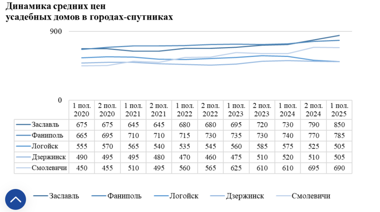 По уровню средних цен выделяются среди городов-спутников Фаниполь и Заславль, где показатели превышают среднее значение по другим спутникам на 27-42% от периода к периоду.