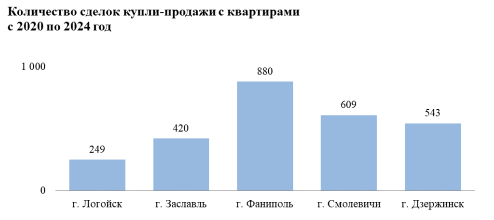 Наибольшее количество сделок с квартирами совершено в Фаниполе: 880 сделок за весь анализируемый период и 176 сделок в среднем ежегодно. При этом наибольшая активность рынка зафиксирована в Смолевичах (2,41%), а наименьшая – в Логойске (1,13%).
