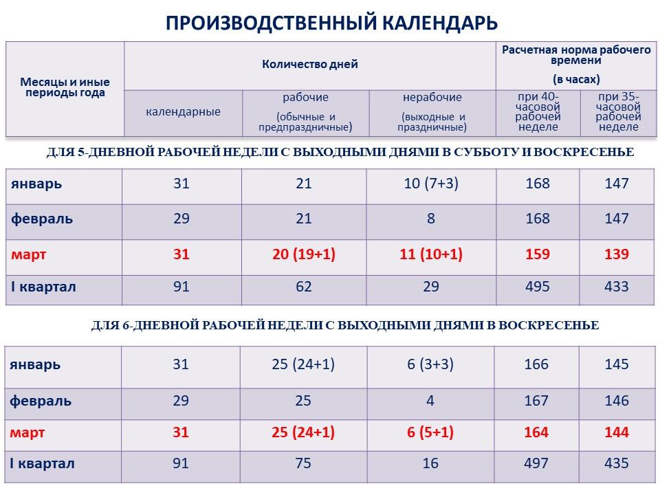 В соответствии с производственным календарем, у белорусов в марте 2024 года при шестидневной рабочей неделе будет 24 рабочих дня и 1 предпраздничный (7 марта), при пятидневной рабочей неделе – 19 рабочих и 1 предпраздничный.