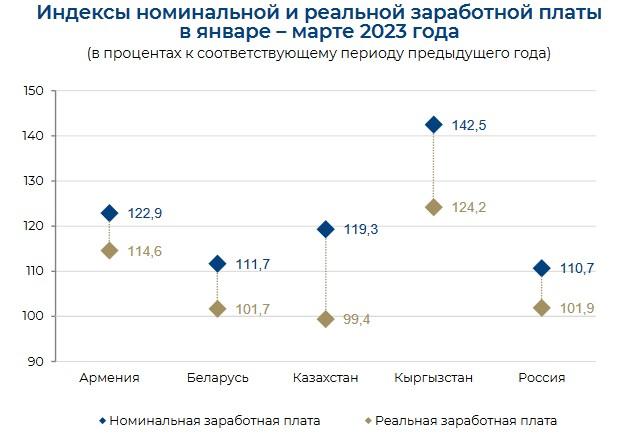 «Самые высокие темпы роста номинальной и реальной (скорректированной на индекс потребительских цен на товары и услуги) среднемесячной заработной платы зафиксированы в Кыргызстане (142,5% и 124,2% соответственно)», – говорится в сообщении ЕЭК от 30 мая.