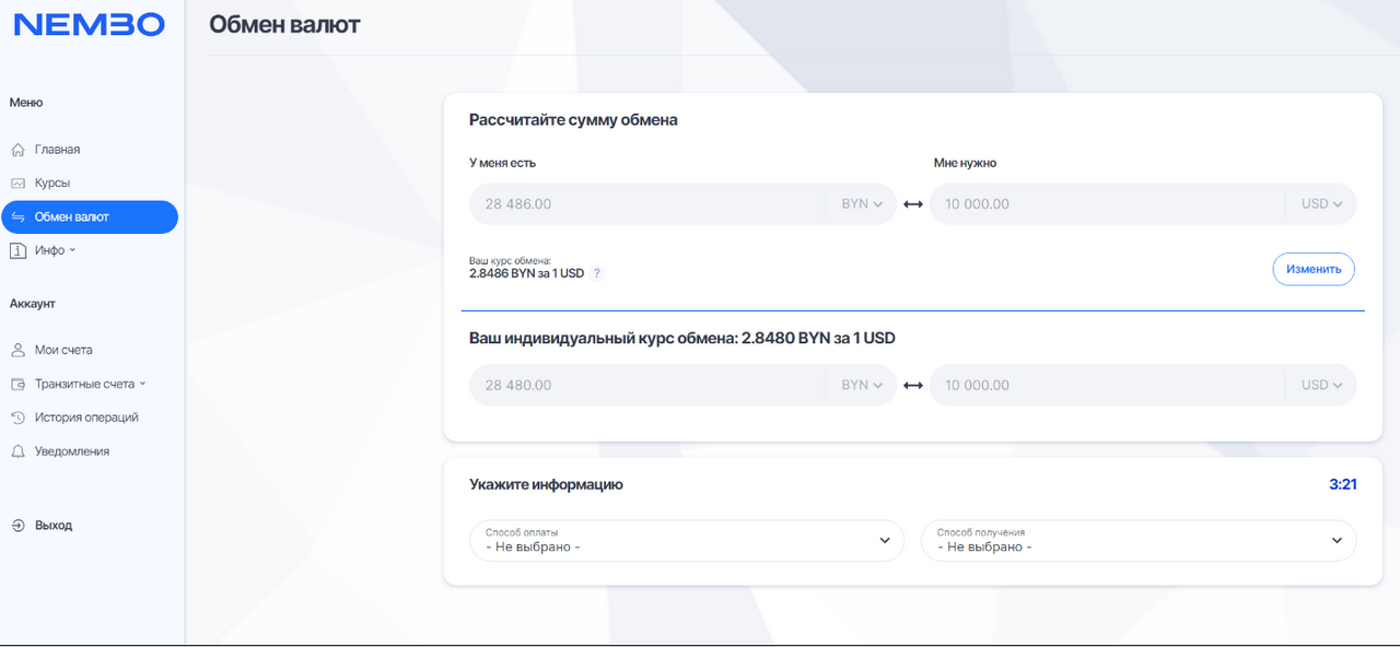 Что ж, пришло время испытать самый надежный вариант покупки валюты. На этот раз использую онлайн-обменник Nembo от МТБанка с функцией фиксации курса валюты на 2 часа в одном из отделений банка. МТБанк не взимает комиссию за проведение операций, а онлайн-регистрация занимает меньше минуты.