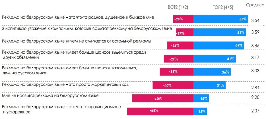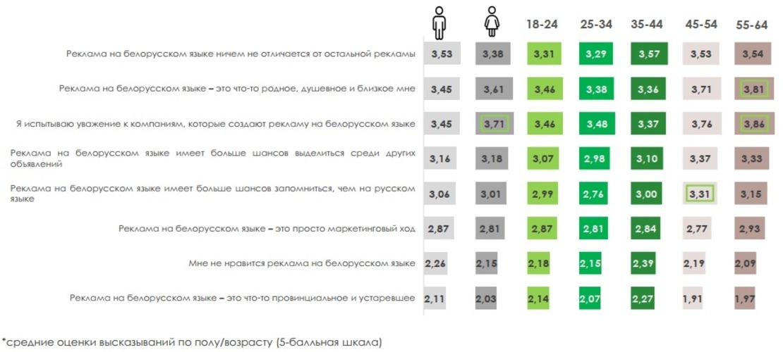 С тем, что реклама на белорусском языке имеет больше шансов запомниться, чаще остальных согласны в возрастной группе от 45 до 54 лет. В возрастной группе от 55 до 64 лет чаще остальных считают рекламу на белорусском языке чем-то родным, душевным и близким.