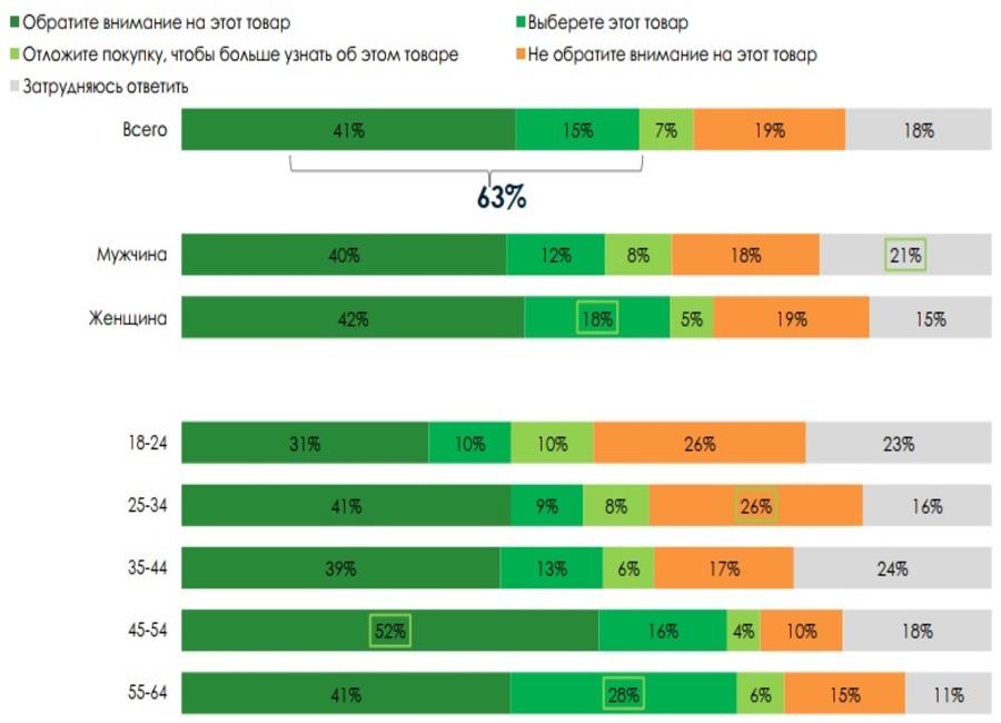 Чаще товар с таким обозначением выберут женщины и возрастная группа от 55 до 64 лет. Чаще остальных обращают внимание на товары с таким обозначением в возрастной группе от 45 до 54 лет, а не обращают – в группе от 25 до 34 лет.