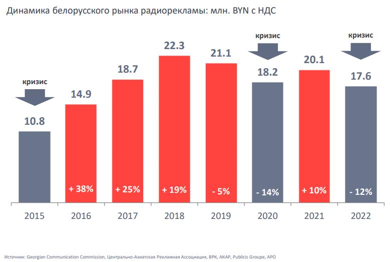 Рынок радиорекламы в Беларуси эксперты АРО оценили в 17,6 млн руб. по итогам 2022 года. Это на 12% меньше, чем в предыдущем году.