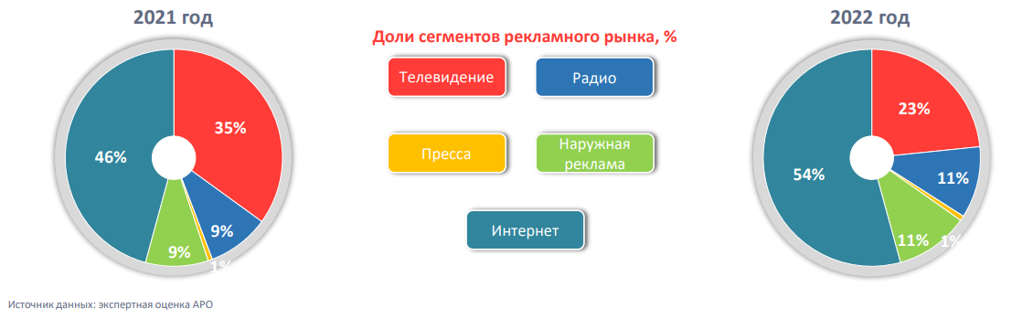 По данным Ассоциации рекламных организаций, в 2022 году доля рынка интернет-рекламы выросла до 54%. Доля ТВ-рекламы снизилась с 35% в 2021 году до 23% по итогам прошлого года.