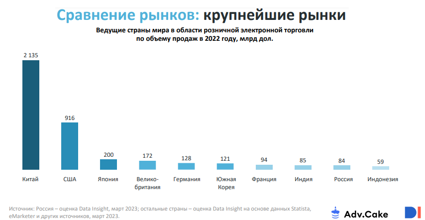 Согласно исследованию Data Insight, крупнейшими рынками в области розничной электронной торговли по объему продаж в 2022 году были Китай ($2135 млрд), США ($916 млрд) и Япония ($200 млрд).