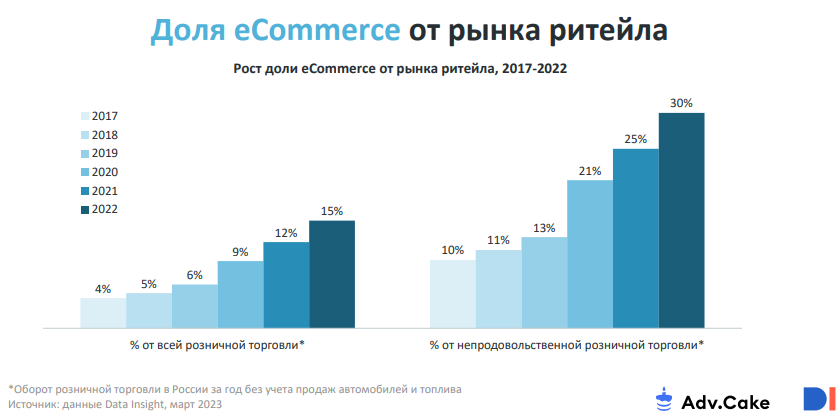 Доля онлайн-продаж в России продолжает расти: в 2022 году на них пришлось 15% от всего ритейла и 30% от рынка непродовольственного ритейла (+3 п.п. и +5 п.п. год к году соответственно).