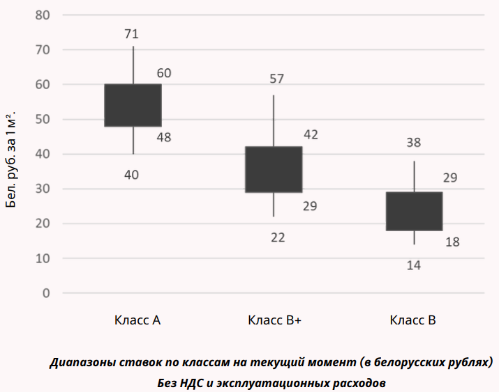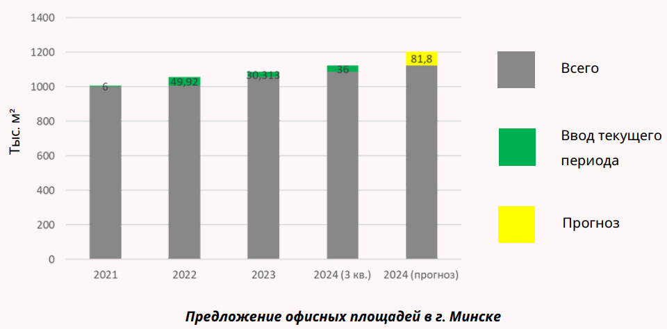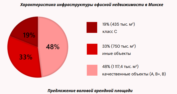 По состоянию на конец III квартала 2024 года в Минске предлагалось 1 млн 117,5 тыс. м² арендной площади в современных коммерческих бизнес-центрах всех классов.