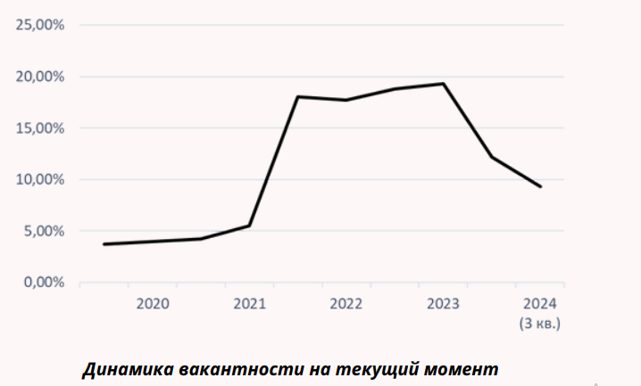 Уровень вакантности за прошедший календарный год, если взять отрезок с конца I квартала 2023 года к I кварталу 2024 года, сократился вдвое. Если в прошлом году вакантность была около 20% от всего предложения, то уже к весне 2024 года составляла около 10%.