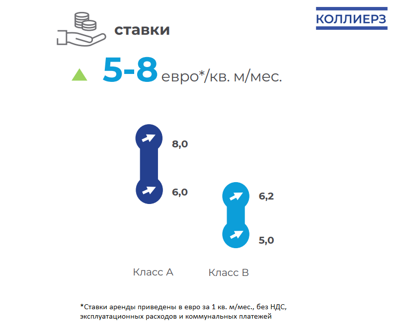 Наиболее высокие ставки фиксируются на площади от 3,5 тыс. кв. м, при этом максимальное значение запрашиваемых ставок в период достигало 10 евро (кв. м/мес).