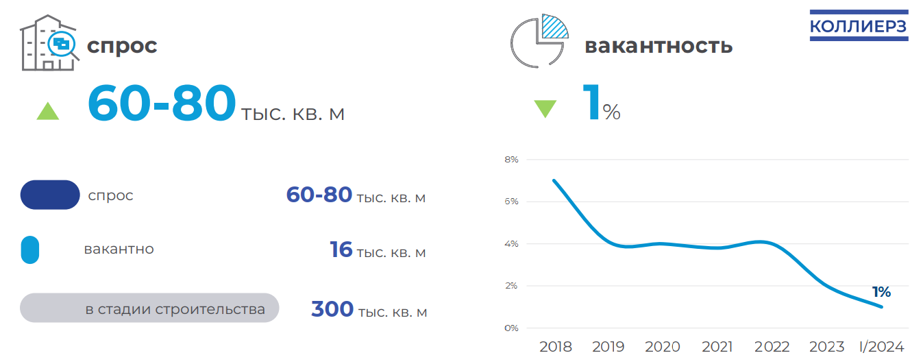 Продолжавшийся в I квартале 2024 года высокий спрос при низкой вакантности провоцирует увеличение ставок аренды и рост интереса арендаторов к складским площадям классов С и D.