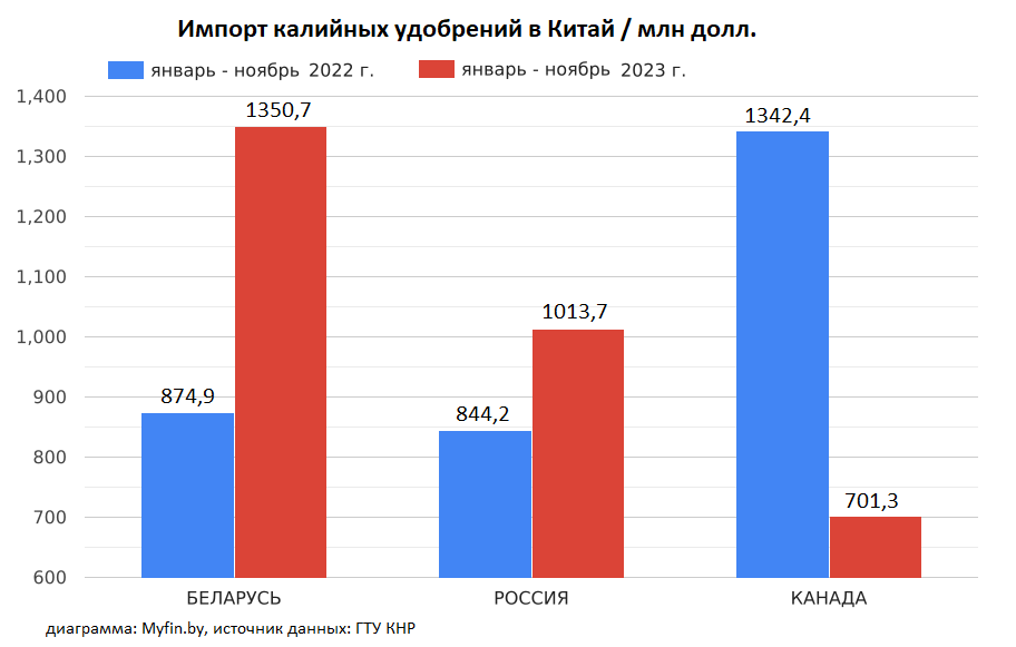 Ключевым поставщиком калия на китайский рынок выступает Беларусь. По итогам 11 месяцев 2023 года КНР импортировала белорусских калийных удобрений на сумму около $1,35 млрд. В январе – ноябре 2022 года сумма была меньше – $874,9 млн.