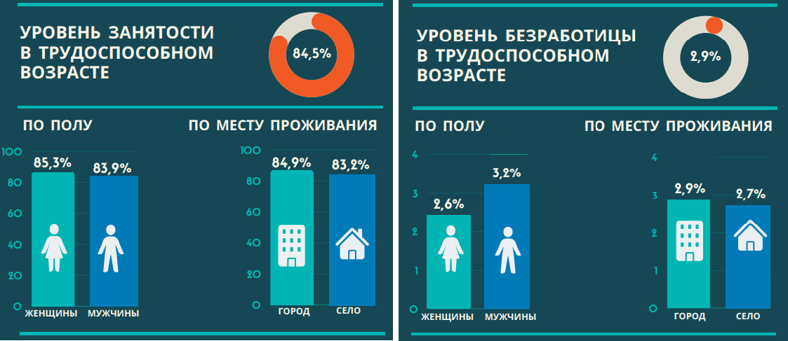Уровень занятости в трудоспособном возрасте составляет 84,5%: женщины – 85,3%, мужчины – 83,9%. Уровень безработицы в трудоспособном возрасте – 2,9%: женщины – 2,6%, мужчины – 3,2%.