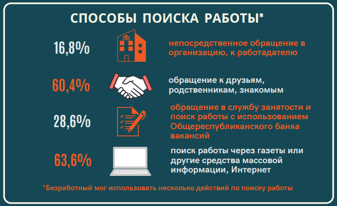 Белорусы чаще всего искали работу через газеты или другие СМИ и интернет (63,6%). А также обращались к друзьям, родственникам, знакомым (60,4%).