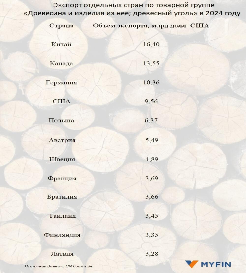 По данным UN Comtrade, в 2024 году в мировом рейтинге экспортеров товарной группы «Древесина и изделия из нее; древесный уголь» первое место занимал Китай.