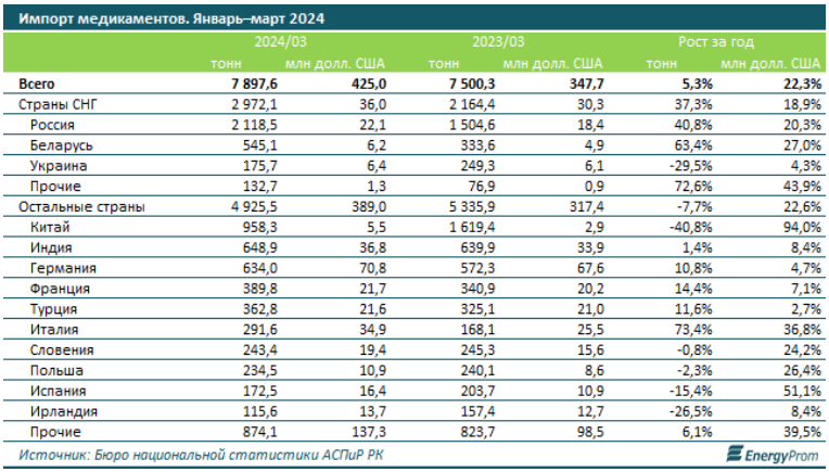 По данным агентства Energyprom, в первом квартале 2024 года Казахстан импортировал 7897,6 тонны медикаментов, заплатив за ввоз $425 млн.