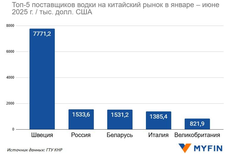 В стоимостном выражении топ-5 поставщиков водки на китайский рынок в январе – июне 2025 года выглядит так:
