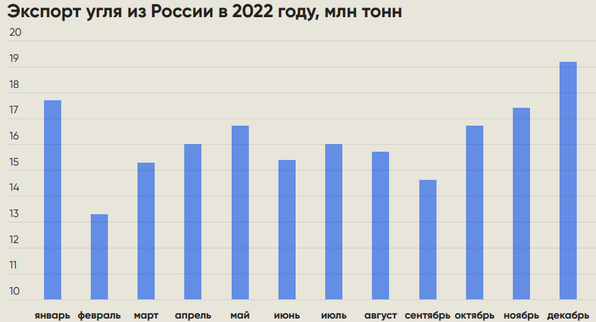 Согласно расчетам ЦРЭ, совокупный экспорт угля из России по итогам года сократился на 13% в годовом выражении – до 194 млн тонн. Самое большое падение поставок зафиксировано в феврале, что было связано с трудностями при транспортировке, а также в сентябре – на фоне введения эмбарго Евросоюзом.