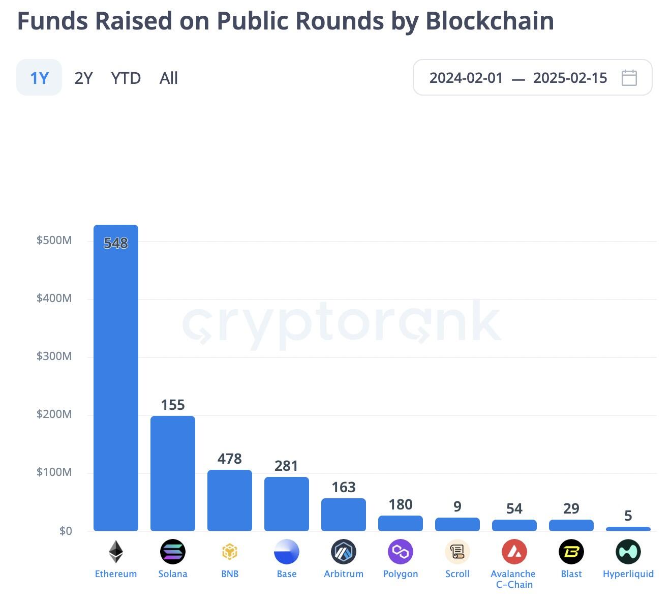 Как и 8 лет назад, главным чейном для проведения IDO остается Ethereum, хотя сейчас на рынке появилось очень много конкурентов. Среди ближайших преследователей – Solana, Binance Smart Chain, Base и Arbitrum, которые характеризуется более низким уровнем платы за транзакции по сравнению с эфиром.