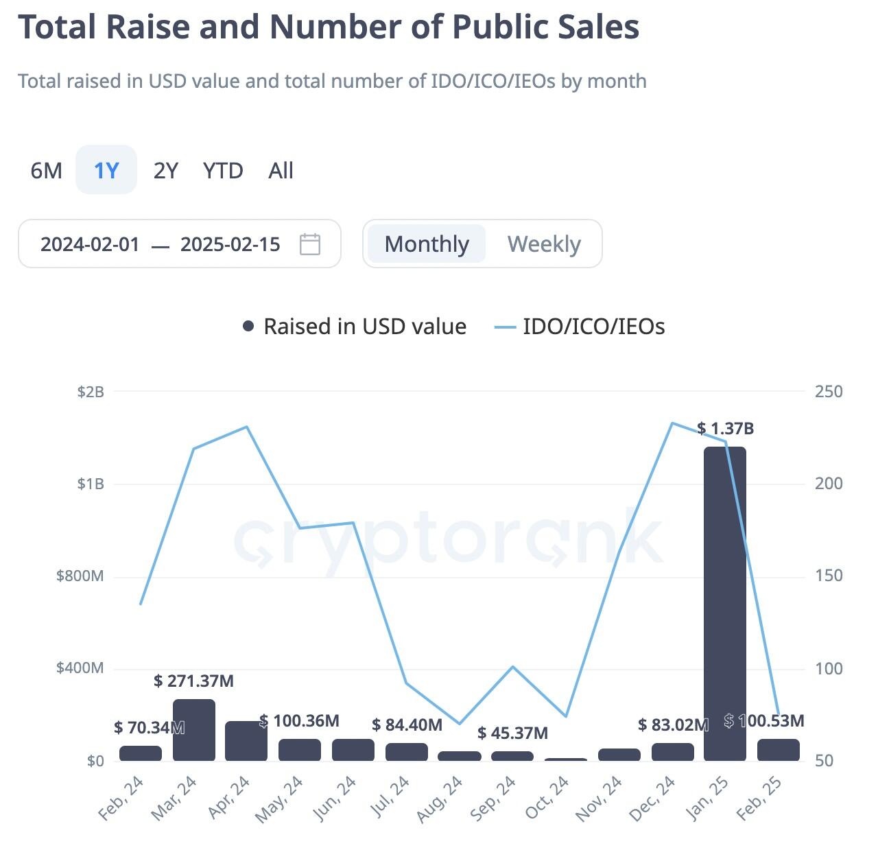 По данным Cryptorank.io, только в январе 2025 года объем привлеченных ресурсов через краудселлинг на крипторынке достиг рекордного объема – 1,37 млрд долларов. Большие объемы наблюдались только в январе, июне и августе 2018 года – в период бума ICO, после которого на рынке установился период тишины.