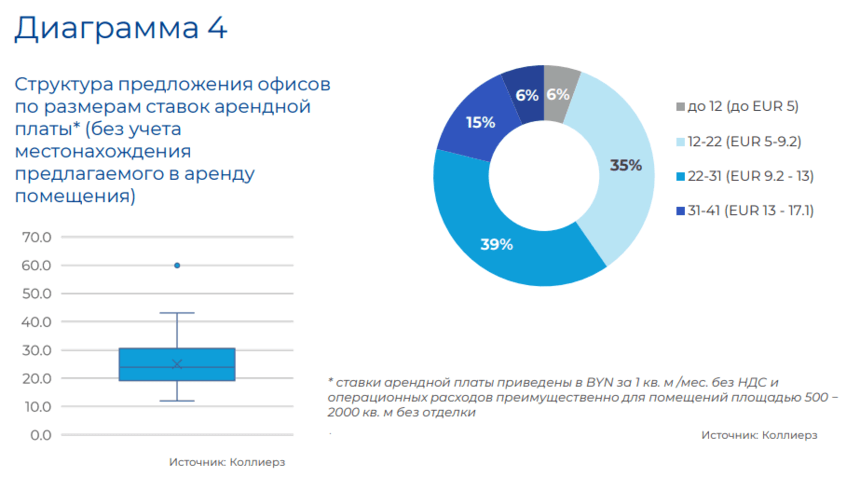 На ближайшую перспективу сохранится тенденция снижения ставок аренды. Нижняя граница (4–5 EUR/кв. м, или 10–12 BYN/кв. м) наиболее характерного диапазона, вероятнее всего, опускаться не будет, а вот верхняя (EUR 12–14, или BYN 29–34) может измениться. К тому же со стороны арендаторов все чаще будут звучать требования предоставления арендных каникул, выполнения ремонтных работ за счет арендодателя и прочих преференций.