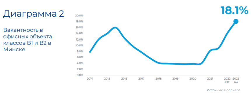 3-м квартале 2022 вакантность достигла 18,1%, при этом в классе B1 вакантность