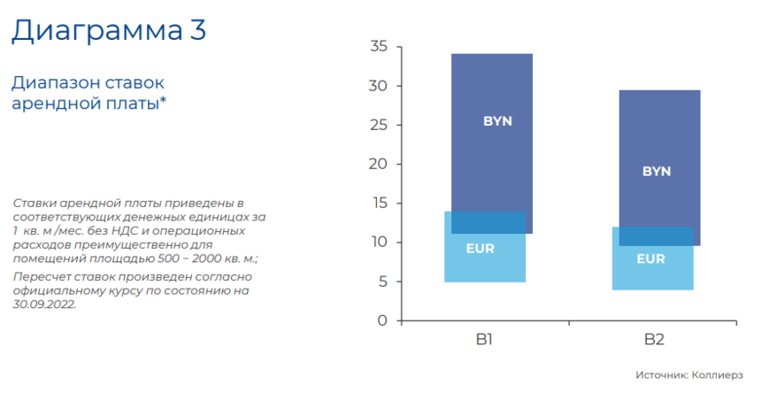Ставки арендной платы продолжили снижение. Большинство предложений аренды в относительно качественных бизнес-центрах Минска находятся в диапазоне 12-29* BYN/ кв. м (5–12 EUR/ кв. м) в месяц. (* Здесь и далее в отчете при пересчете валют применяется официальный курс белорусского рубля по отношению к иностранным валютам, устанавливаемый Национальным банком Республики Беларусь на 30.09.2022)