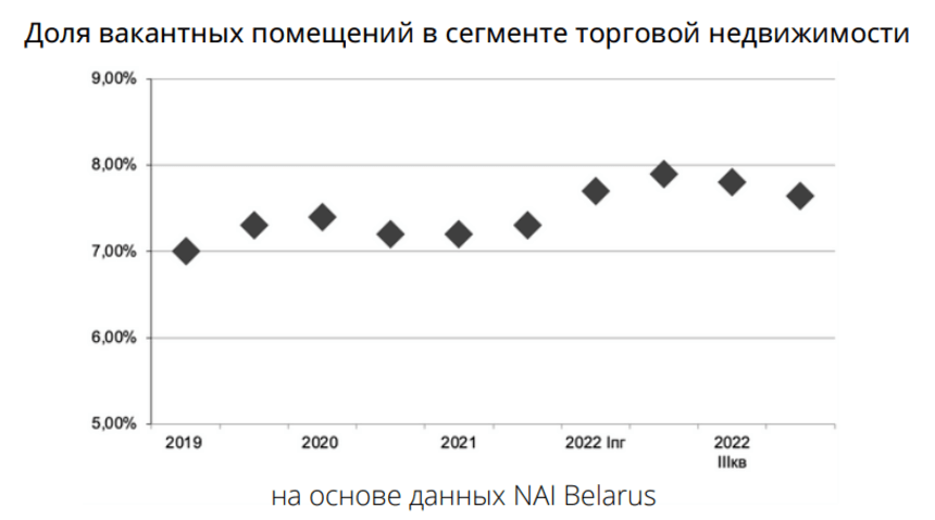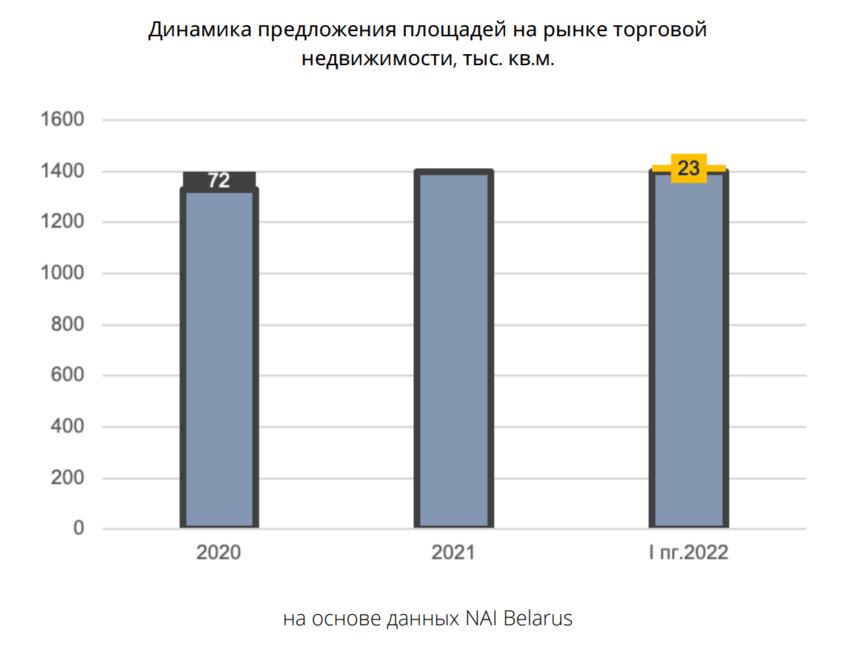 Заметного роста вакантности на минском рынке торговой недвижимости не произошло и в сложном по геополитическим причинам I полугодии 2022 г., поскольку сохранялся умеренный спрос на торговые площади, а отказ от аренды в период марта – апреля не носил массового характера.