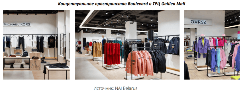 Рынок спроса постепенно вырабатывает правила работы в условиях влияния санкций. Так, ответом на произошедшее сокращение арендуемых площадей международными брендами стало расширение так называемых «концептуальных пространств», где представлены белорусские дизайнеры со своими коллекциями. В ТРЦ «Галилео» организовано пространство Boulevard Concept Store, где представлены как известные мировые бренды, так и бутики ряда белорусских дизайнеров; в ТРЦ «Галерея Минск» организовано пространство REOPENING TREND PARK!, в котором представлен 21 дизайнерский магазин; в ТРЦ «Дана Молл» открылось пространство WEARE с 20 белорусскими брендами. Все эти пространства или были организованы, или расширялись и развивались в период III квартала.