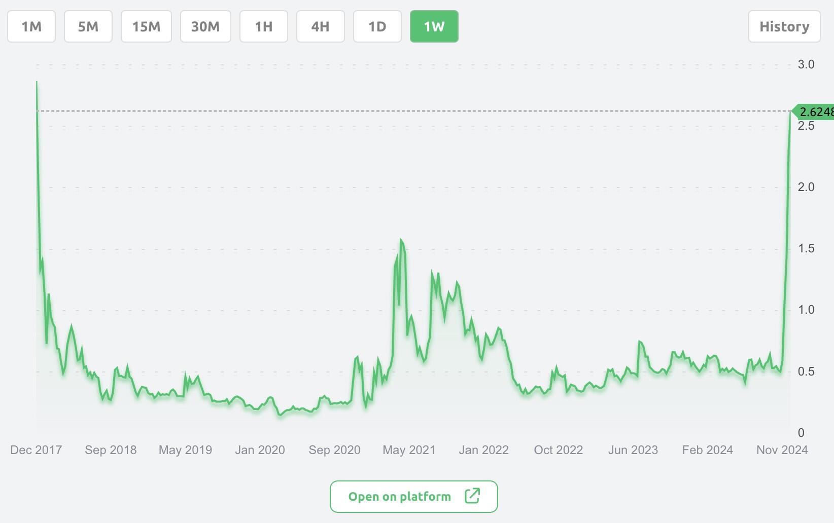 Значимым последствием избрания Трампа стал и резкий рост XRP - криптовалюты проекта Ripple, который с 2020 года находится в судебных разбирательствах с SEC. И хотя XRP не смог обновить абсолютный максимум, он смог вырасти до максимальных отметок с 2018 года.